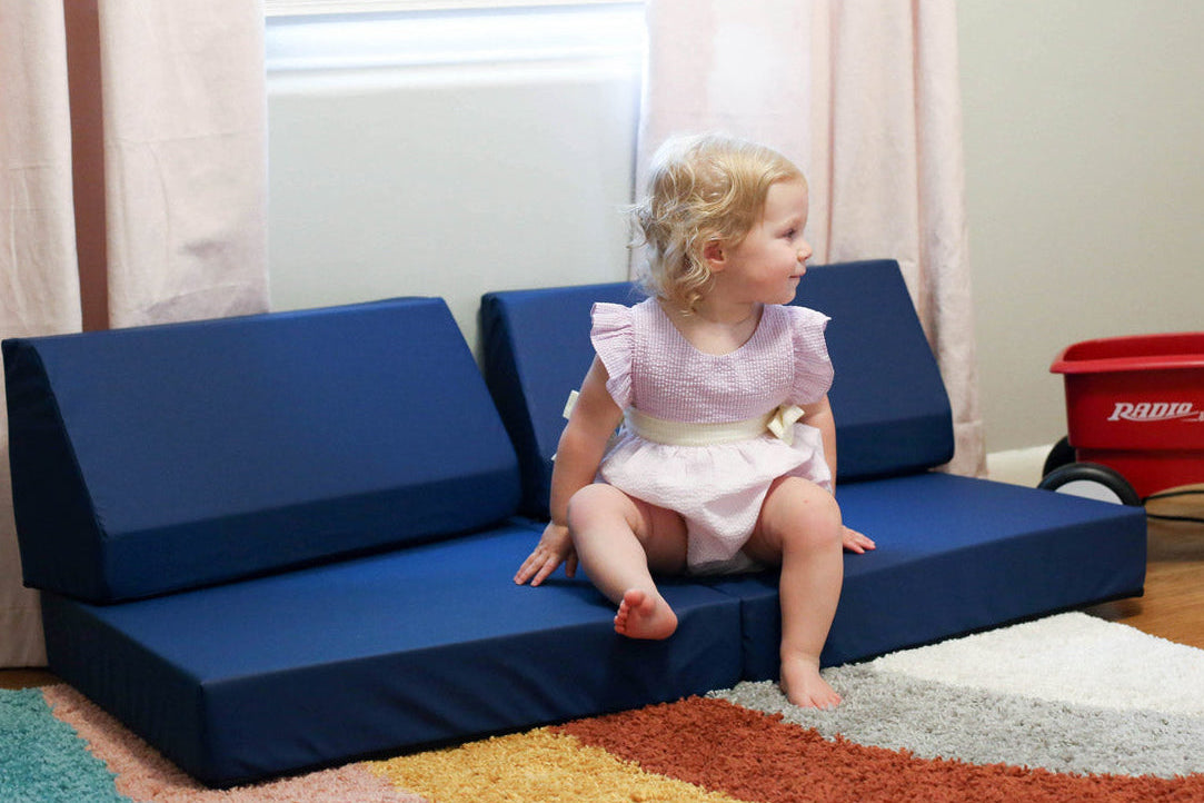 Toddler sitting on Foamnasium Blocksy Mini in Navy in a playroom